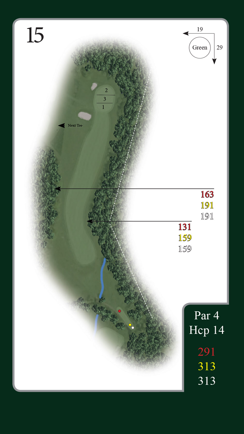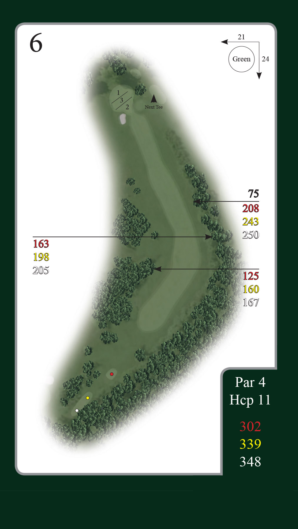 Hold godt i højre hele vejen til green, og prøv at abstrahere fra de høje træer på begge sider af fairway. Nyd dette fantastiske golfhul!
